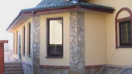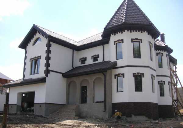 Стены монолитного дома из арболитаСтены строения из арболита могут быть покрыты штукатуркой или другим более прочным отделочным материалом: