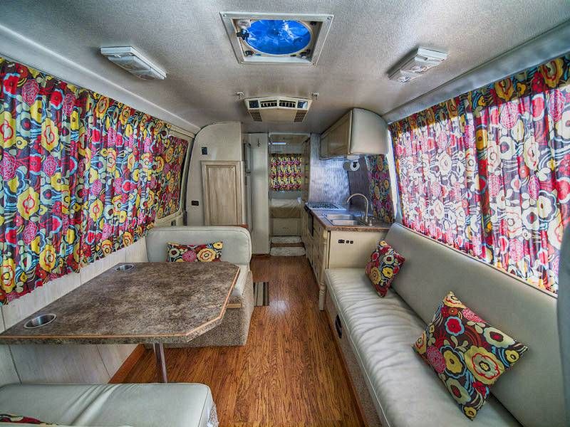 Планировка автодома проста до безумия. Полностью открытое пространство перетекает из одной комнаты в другую. Никаких перегородок между залом-столовой или спальней попросту нет. Все ранее стоявшие стулья были утилизированы и вместо них постелили ламинат. Мебель собирали из различных блошиных рынков. Какую-то сконструировали сами, ну а другую приобрели по низкой цене. Книжные полки и некоторые столики — самые обычные предметы интерьера, как и пуфики, стулья и столешницы. Удачно подогнать одно под другое — вот была самая сложная задача, с которой умелые руки и зоркий глаз справились.