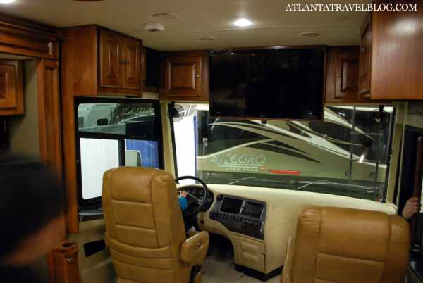 22. А так выглядит место водителя дома на колесах типа A (Type A Motor Home), самых больших и дорогих мотодомов. Среди всех этих диванов, шкафчиков, телевизора рулевое колесо взывает удивление, не так ли?