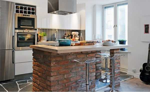 - Кирпич. Барная стойка на кухне своими руками, выполненная из кирпича, смотрится очень выигрышно практически в любом интерьере. Декоративные качества этого материала сложно переоценить, но и заплатить за такую отделку придется немало.