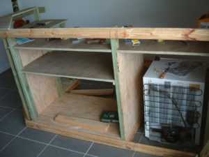 ![]() | Шаг 4. Крепление нижней столешницы. Из листов ДВП делаем нижнюю столешницу и крепим ее к каркасу на саморезы. Из листов фанеры делаем перегородки внутри нашей конструкции, образуя в ней несколько отделов. |