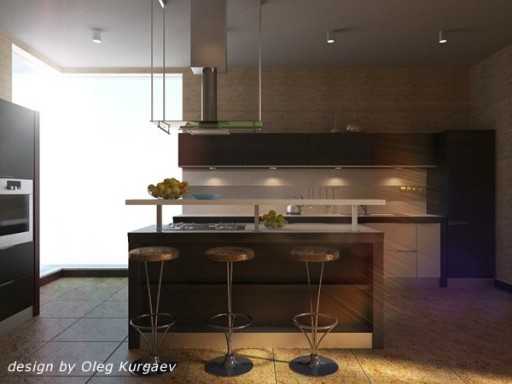 В этой кухне с барной стойкой-островом от Олега Кургаева создана интимная и уютная обстановка, несмотря на современный стиль оформления