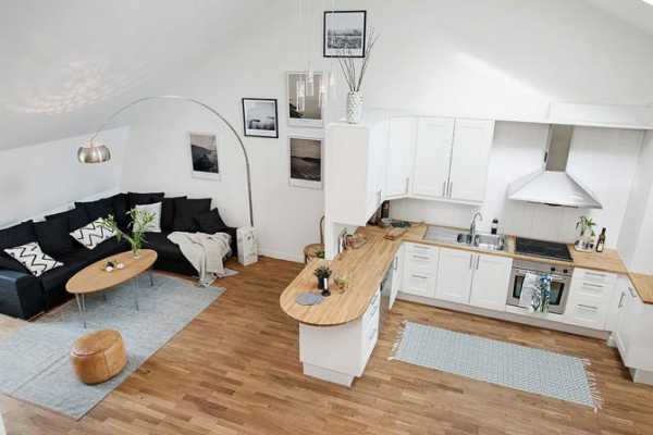 Развернуть диван к телевизору передом, а к кухне задом, расположив позади него стойку — тоже неплохое решение для открытого пространства