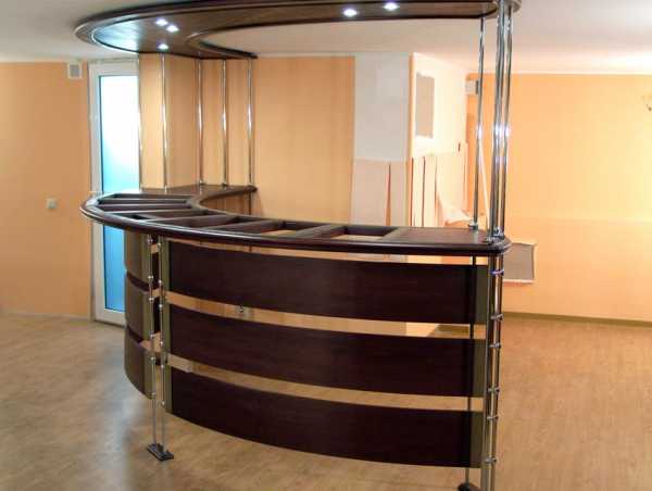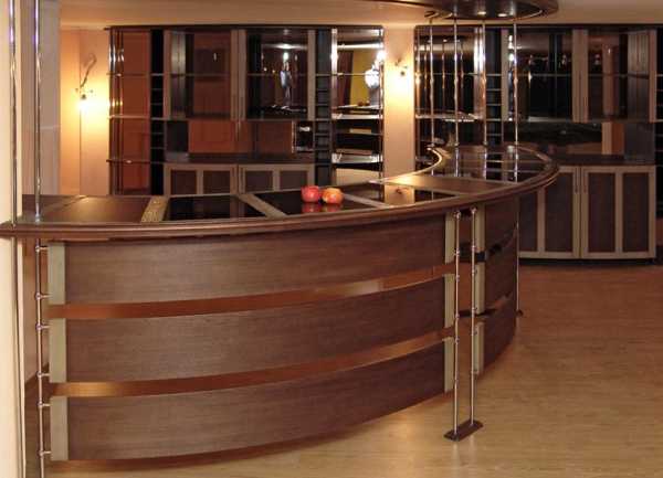 Современные модели барных стоек не всегда представляют собой прямоугольную столешницу на ровной основе или консольной подставке. К примеру, стойка может быть выполнена в виде полукруга или изогнутой линии, выходящей из столешницы.