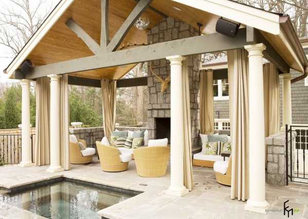 Сложно назвать беседкой это открытое сооружение с античными колоннами, светлые, пастельные оттенки которого создают невероятно утонченную атмосферу изящного комфорта. Небольшой водоем по соседству, большая каменная печь, светлая плетеная мебель с мягкими подушками – все здесь работает на создание элегантности уличного строения для отдыха.
