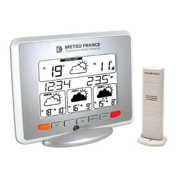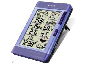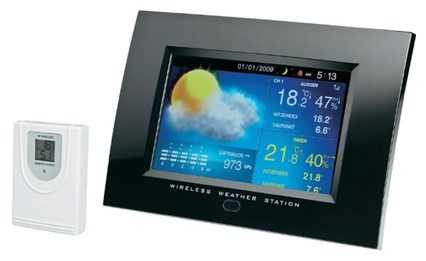 - Приемника настенного или настольного исполнения, на котором расположен ЖК дисплей с текущей погодной информацией и прогнозом погоды на ближайшие 12-36 часов. В зависимости от модели, на дисплее дополнительно могут отображаться время и дата, фаза луны, скорость движения воздушных масс и направление ветра, суточное количество выпавших осадков и еще многое другое. Дисплей может быть цветным или монохромным, иметь подсветку, а также показывать прогноз посредством смены анимированных картинок. Питание приемного дисплея может осуществляться посредством АА; ААА батареек, АКБ или от сети 220 В.