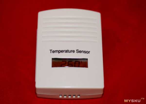 Теперь рассмотрим внешний датчик. Выполнен из пластика, на передней стороне маленький ЖК экран, отображает температуру.