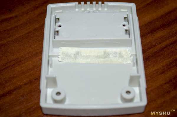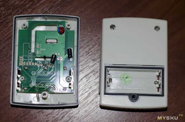 На задней стороне находится батарейный отсек. Питается устройство от двух батареек АА.