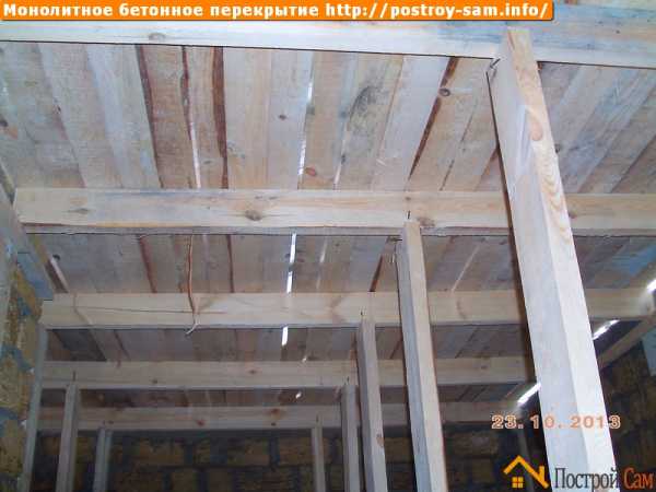 2)Другой способ сделать бетонное перекрытие для дома. Сначала делаем опалубку из 25-миллиметрового теса. Прогоны делать на расстоянии 50-70 см. Затем укладываем на опалубку гидроизоляцию, например, полиэтиленовую пленку или рубероид. Желательно закрепить пленку степлером. Теперь укладываем бетон, выравниваем его. Сверху лучше накрыть пленку, чтобы он подсыхал постепенно и не трескался.
