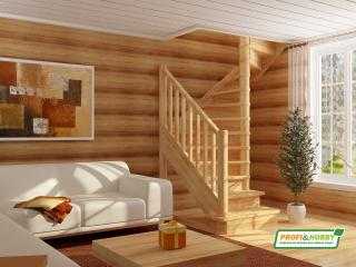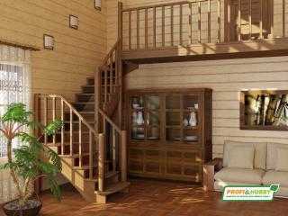 Лестница производится из сосны, бука, ясеня или дуба, имеет Г-образную конструкцию и площадку с разворотом на 90 градусов. На верхних уровнях устанавливаются ограждения. Лестница органично впишется в дизайн дома с деревянной отделкой, она надежна и безопасна.