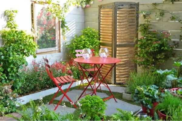 Какие еще предметы использовать для благоустройства двора? Для скромного по размерам участка прекрасно подходит складная легкая мебель, которую можно в любой момент собрать и унести. В небольшом заднем дворике можно поставить маленький узкий стол.