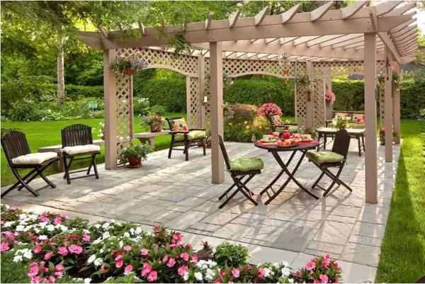 - Зона отдыха. В первую очередь, необходимо выделить отдельную территорию под зону отдыха. В этой зоне необходимо расположить беседку со столом, удобными стульями или скамьями. Стол может быть как стационарным, так и складывающимся. Обязательно требуется установка тента или крыши, чтобы можно было укрыться в случае дождя или палящего солнца. Также, в этой зоне будет уместным расположить площадку для приготовления шашлыка. Зону отдыха необходимо украсить клумбами с красивыми цветами.