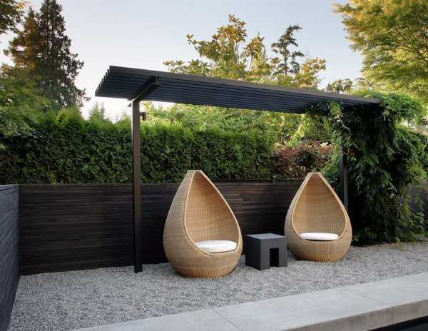 В дизайне внутреннего двора частного домовладения очень эффектно смотрятся плетеные беседки. Такие конструкции вызывают ассоциации с садами, окружавшими особняки аристократов.