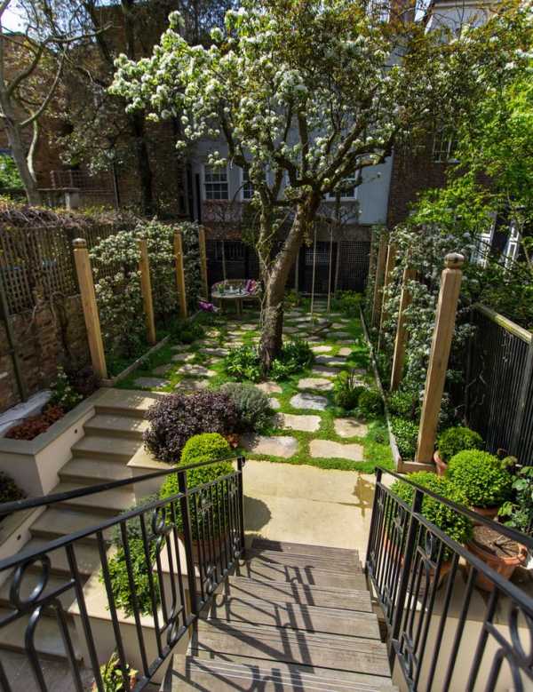 - спроектировать тропинки диагонально — это зрительно увеличит двор;