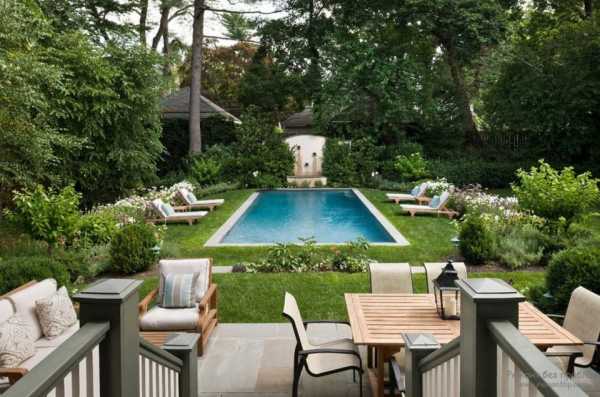 Ландшафтный дизайн двора частного дома с бассейном напротив дверей