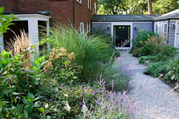 Второй часто встраивающийся вариант оформления места вдоль дорожек — цветники. И, снова-таки, их можно сделать «по-современному» — на фоне засыпки щебнем или мульчей. Рокарием такое назвать нельзя, хотя идея взята оттуда.
