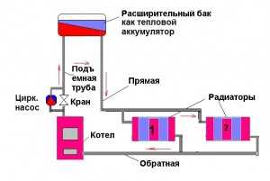 В качестве дополнительного бака можно поставить расширительный бак увеличенной емкости с двумя (это обязательное условие теплообмена) вводами: вход и выход. Или разместить герметичный и теплоизолированный бак, рассчитанный на давление в системе, в любом удобном месте системы отопления (можно приспособить электрический бойлер, правда, емкостью, желательно, не меньше 200 литров, а это много!!!). Можно предусмотреть возможность подключения этого бака к системе отопления, в случае необходимости.