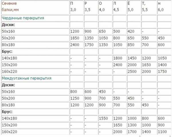 Что же касается расстояния между балками (или, как принято говорить, размер шага укладки) – он определяется, исходя из данных о сечении материала, а также от длины пролета. Для удобства, это расстояние можно определить по соответствующей таблице.