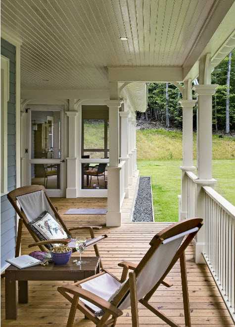 Не нужно стараться сделать потолок деревянной веранды изысканным. Настоящим украшением такого потолка станут деревянные балки, выступающие внутрь веранды. В случае, если пол деревянной веранды отделан искусственным камнем, на потолке отлично будут смотреться бордюры, проходящие по всему периметру помещения. Такие бордюры будут отличным основанием для панорамных окон.