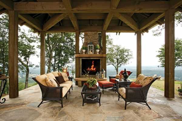 Основным преимуществом декоративных элементов из природных материалов, является то, что они легко сочетаются между собой. В интерьер деревянной веранды отлично впишется камин, с отделкой из натурального камня. Помимо своей основной функции, камин делает интерьер веранды колоритным.