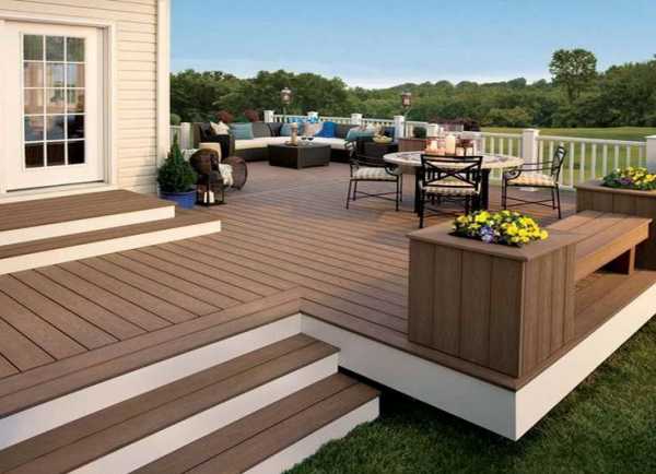 Деревянная терраса. Лидерами террасного строительства являются деревянные террасы. Они вмещают массу достоинств: быстрое возведение, небольшие финансовые затраты, многовариантность исполнения и эстетику натуральной древесины. Сложностью может стать последующий уход — чтобы защитить дерево от разрушающего действия всепроникающей влаги, его необходимо регулярно обрабатывать пропиткой на основе масла и антисептика.