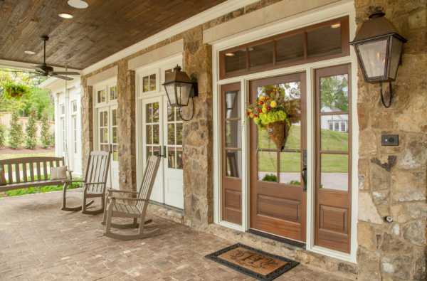 Декор стен деревянной веранде должен соответствовать оформлению пола. Стены можно обшить деревянными панелями, или облицевать поверхность искусственным камнем.