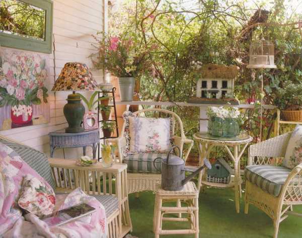 Важно! Обязательным элементом террасы в стиле кантри является небольшой зеленый уголок с кадками, в которых посажены разнообразные растения.