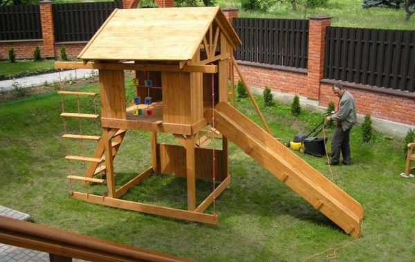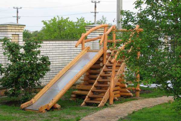 Или горка со скатом из дерева. Такую можно и на солнце «выставить». Но, без ежегодного ухода, максимум через пару сезонов, вы получите «терку», усыпанную сколами и заусенцами.