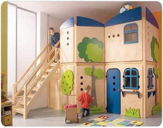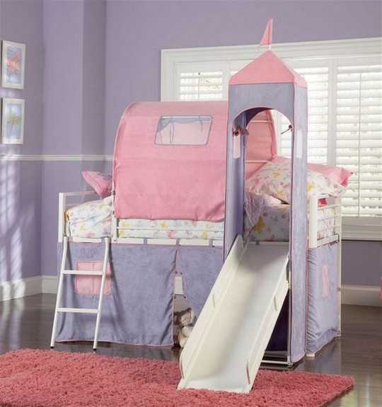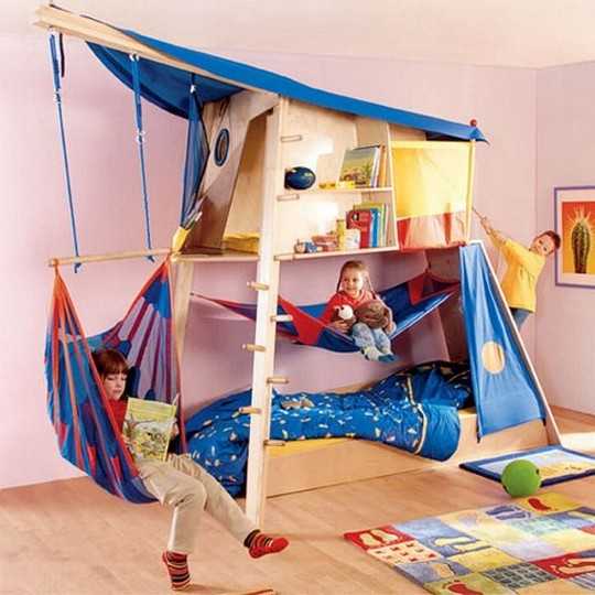 - Игровой домик в комплексе с кроваткой – идеальное решение, когда хочется совместить приятное с полезным. В этом случае пространство комнаты используется не по горизонтали, а по вертикали: такая конструкция представляет собой что-то вроде двухъярусной кровати, только вместо одного из «этажей» – комнатка для игр. Этот комплекс может быть оборудован горкой, лесенкой, полками для книг и игрушек, гамаками и канатами. Получается настоящий сказочный уголок, где ребенок может и спать, и активно проводить время за разными играми.