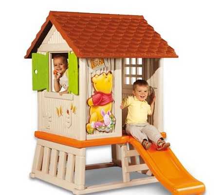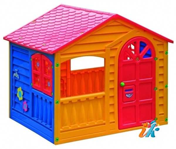 - Пластиковые домики. Пластиковые домики состоят из сборных панелей. Стены, крыша и двери такого домика легко крепятся друг к другу и так же легко разбираются в случае необходимости. Ухаживать за таким домиком элементарно: он легко моется теплой водой с мылом, поэтому никакие последствия детских игр ему не страшны. Огромным плюсом пластиковых домиков, кроме их мобильности и компактности при хранении, является разнообразный дизайн. Пластиковый домик можно выбрать как для нежной девочки (с милыми узорами, в розовых тонах и т.д.), так и для мальчишки-сорванца (например, в форме пиратского корабля). Такие домики бывают даже двухэтажными. При желании можно выбрать домик, «игровые возможности» которого дополнены горками, качелями и другими детскими радостями. Детские игровые домики делаются из нетоксичного пластика, поэтому прямые солнечные лучи им не страшны. Вообще, такие домики очень устойчивы к любым погодным условиям. Обычно в пластиковых домиках имеются стульчики и маленький столик, но если размеры домика позволяют – там может появиться и другая мебель.