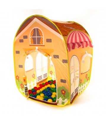 - Игровая палатка – очень компактный и экономичный вариант домика для ребенка. Самую простую палатку можно соорудить из деревянных реек или пластиковых трубочек и ткани. Конструкция такой палатки напоминает вигвам, поэтому при желании ее можно украсить соответствующим образом. Кроме треугольных палаток-вигвамов существуют палатки с каркасом из металлических прутьев, обтянутых плотной тканью. Формы таких палаток самые разнообразные: от простейшего домика с четырьмя стенками и крышей до пиратских кораблей и комплексов с туннелями и лабиринтами. Такие палатки очень легко складываются до плоского состояния, поэтому хранить их очень легко. Еще один плюс такой палатки – из нее легко можно сделать шариковый бассейн, насыпав туда несколько сотен пластиковых шариков диаметром до 10 см. Игры в шариковом бассейне – массаж всего тела для ребенка и море веселья.