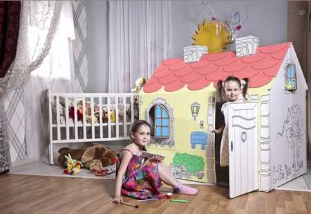 - Картонный домик. Картонный игровой домик можно легко сделать своими руками. Для этого понадобятся несколько больших картонных коробок и фантазия. Такой домик можно украсить аппликациями или обтянуть тканью. К оформлению домика может «приложиться» и сам малыш: его поверхности идеально подойдут для рисования красками и маркерами, так что первые творческие пробы ребенок может совершать без ущерба обоям и дверям в квартире. Картонный домик достаточно хрупкий, поэтому лучше всего он подойдет для самых маленьких детей. Обстановку в домике можно так же создавать своими руками.