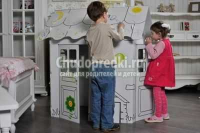 Оригинальный вариант игрового домика для занятых родителей – сделать его из подручных материалов. Нередко это может быть плотный картон. Лучше использовать стандартные листы, которые легко кроить, а потом соединять в конструкцию.