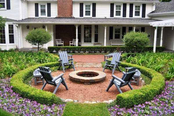 Хорошей современной идеей для дизайна двора частного дома является специально обустроенное место для костра, вокруг которого вы сможете удобно расположиться прохладным вечером.