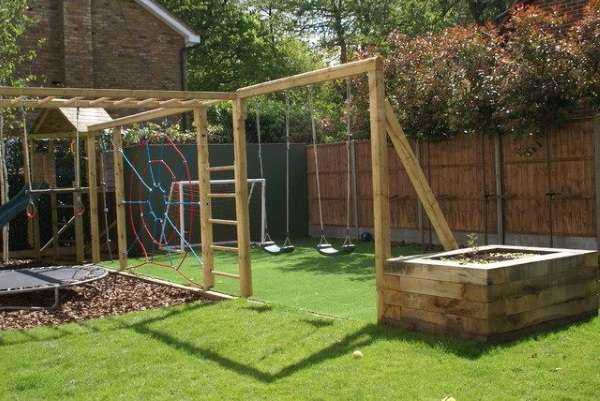 Если же у вас есть маленькие детки или внуки, вы можете организовать в саду детскую площадку с качелями, батутом, лестничками и другими приспособлениями. Это позволит и им активно отдыхать, и вам не переживать за их безопасность.