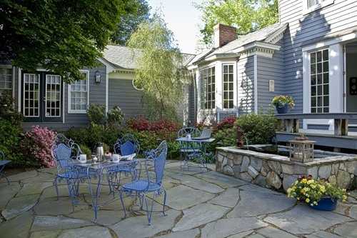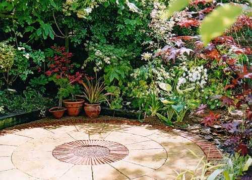 Патио, вымощенное каменными плитами по кругу. По углам цветы в кадках.