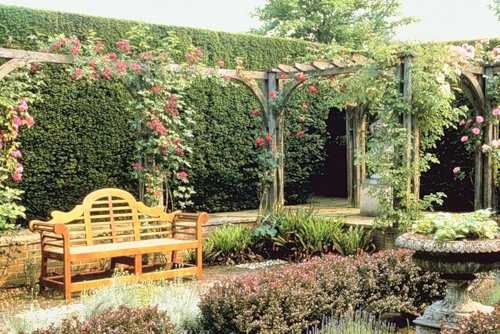 Перголы с плетистыми розами и деревянная скамейка.