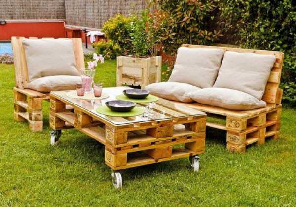 Из деревянных поддонов давно уже создают практически бесплатную садовую мебель. Потратиться придется только на краску и стилизованную обивку. Старые ящики и бочки сгодятся в качестве оригинальных клумб.