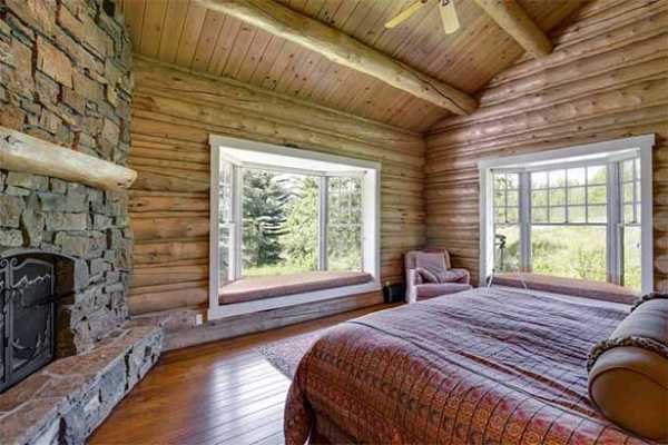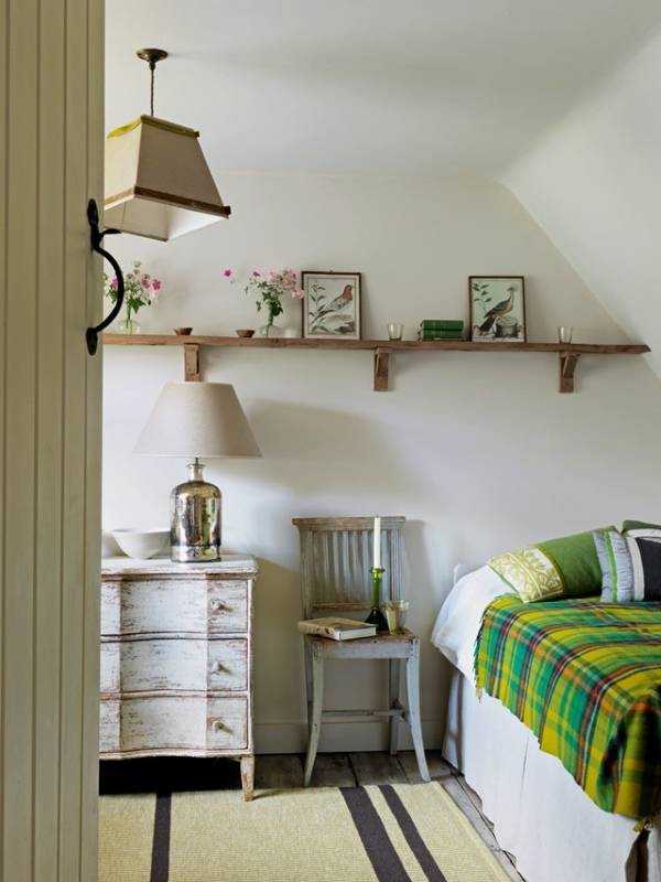 В небольшом коттедже спальню располагают в мансардном помещении. Здесь не бывает много света, следовательно, стены и балку нужно выкрасить в светлые тона. Кровать может быть выполнена из дерева или кованого металла. Для создания уюта потребуются бра или торшеры с мягким светом, ковёр с длинным ворсом, тумбочки и тяжёлые портьеры.
