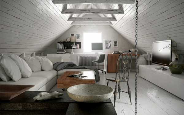 Оформление мансарды предполагает акцент на конструктивных элементах здания: