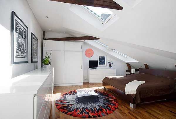 Место для хранения. Высокие потолки в мансардах позволяют встроить шкафы, установить рейлы для хранения одежды, расставить комоды вдоль стен.