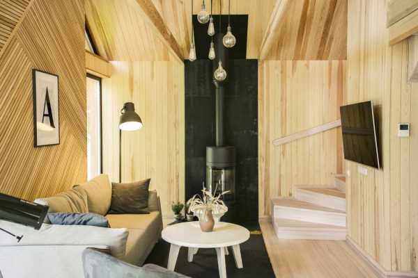 Размещение зоны для ежедневного отдыха в мансардном помещении позволяет сэкономить место на первом этаже. Такое решение используют хозяева миниатюрных домов с совмещённой кухней-гостиной: