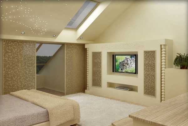 - Спальня. Довольно популярный вариант. Мечтали когда-то заснуть, глядя на звездное небо? У вас появится такая возможность. Поставьте кровать, несколько тумбочек, телевизор и другие элементы мебели.