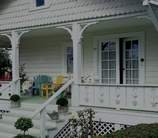 - Крыльцо для дома, оформленного в викторианском стиле, строгое и аккуратное. Основной массив дерева упрятан под облицовку, тем не менее деревянная основа крыльца легко читается по колоннам и элементам декора, фото;