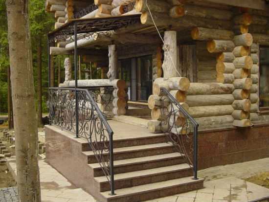 Колоритности и массивности частному дому сможет придать рубленое крыльцо, созданное из оцилиндрованного типа бревен. Такую конструкцию пристраивают к маленьким строениям и большим усадьбам, причем она будет смотреться одинаково выгодно (в этом можно убедиться по фото). В качестве косоуров подойдут разной длины бревна, выложенные перпендикулярно фасаду дома.