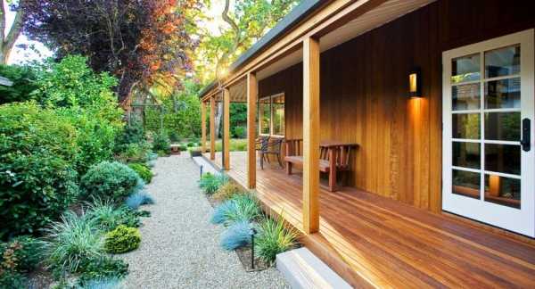 Есть и еще одно решение – дизайн крыльца может перекликаться с дизайном участка. При грамотной реализации этой идеи, создается впечатление, двор и дом – это неделимые части единой конструкции. Снизу представлен дизайн крыльца частного дома, фото хорошо демонстрирует, как «замаскировать» пристройку под ландшафт.