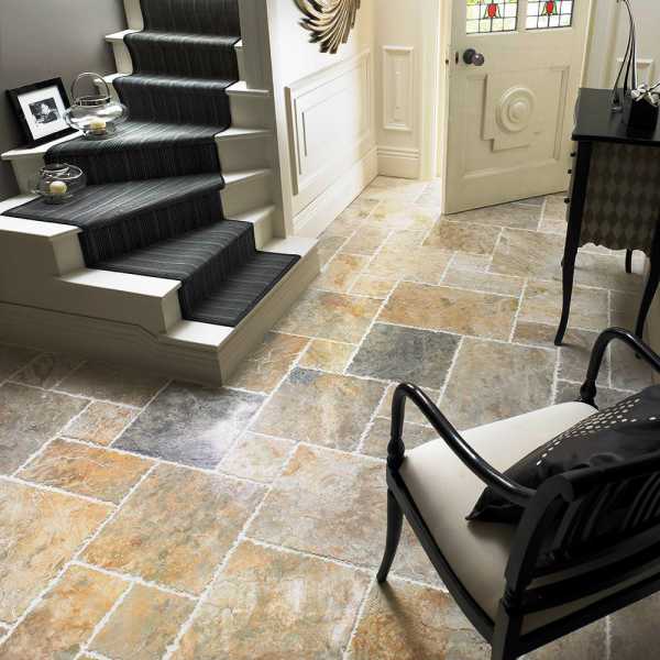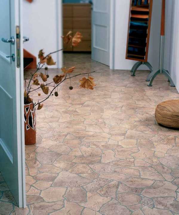 Линолеум с рисунком под камень в прихожей.- Паркет штучный, представляет собой бруски из массива натурального дерева. Укладывается на подготовленную поверхность, сверху покрывается специальным воском или лаком;