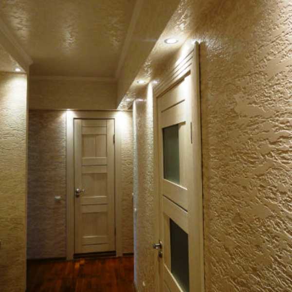 Отделка просторной прихожей ламинатом.- Декоративная штукатурка позволяет создать фактурную поверхность стен. В составе используются элементы имитирующие мрамор, кору дерева, рельефную фактуру. Надежное, интересное покрытие для просторных коридоров;