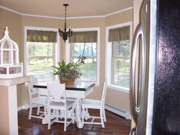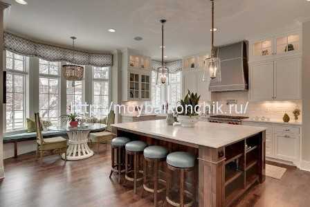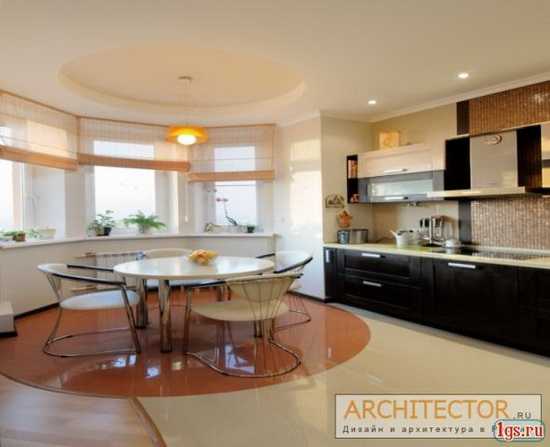 Эркер в столовой. Позволяет грамотно и рационально зонировать пространство – на обеденную (столовую) зону и собственно кухню. В эркере можно поставить круглый обеденный стол, для экономии пространства вдоль окна установить узкую мягкую лавочку или сделать из подоконника посадочные места. С одной стороны, это позволит разместить больше гостей, с другой, при небольшой численности гостей – отказаться от стульев, тем самым сохранив визуальный контакт с кухонной зоной. И человек, занимающийся на кухне, может принять участие в общем разговоре, он не будет чувствовать себе «отрезанным».