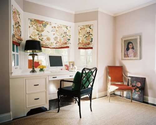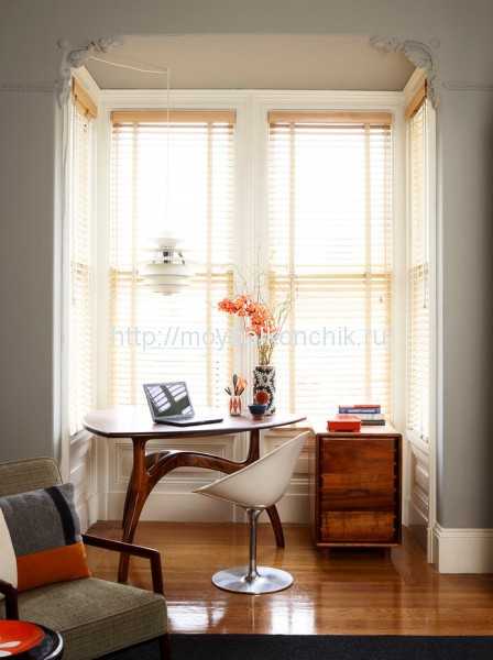В данном случае ваша задача подобрать стол, повторяющий линии эркера. Лучше всего подойдет стол-подоконник. Конструкция, совмещенная с подоконником, и выполняя одновременно две функции. Для окон лучше выбрать жалюзи, так как занавески будут только мешать. Рабочая зона в эркере подойдет для людей романтичных и размеренных, а также для собранных и практичных.